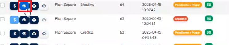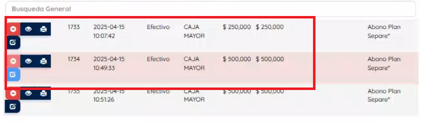 Ya nos aparece el Plan Separe convertido, con el número de la factura generado. Aquí también se muestra el historial de los pagos abonados, y puedes ver tanto el Plan Separe original como el número de la factura en la que fue convertido.