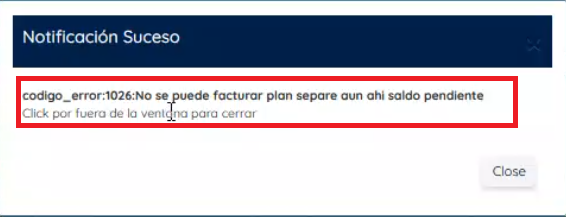 En este punto, el sistema nos va a arrojar un error, indicando que el Plan Separe aún tiene un saldo pendiente, y que la factura está pendiente por pagar.