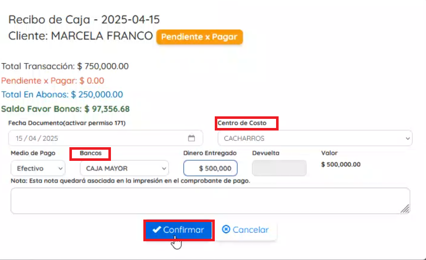 Entonces, vamos al ícono de la monedita, seleccionamos el banco, colocamos el saldo pendiente, y le damos en Confirmar. Veremos que el sistema cambia el estado del documento.